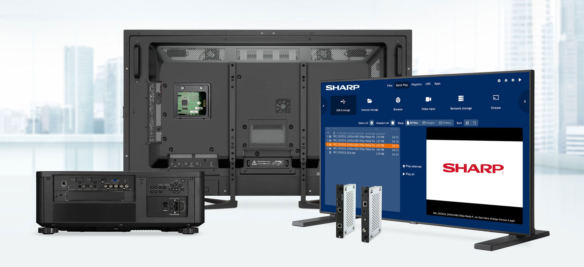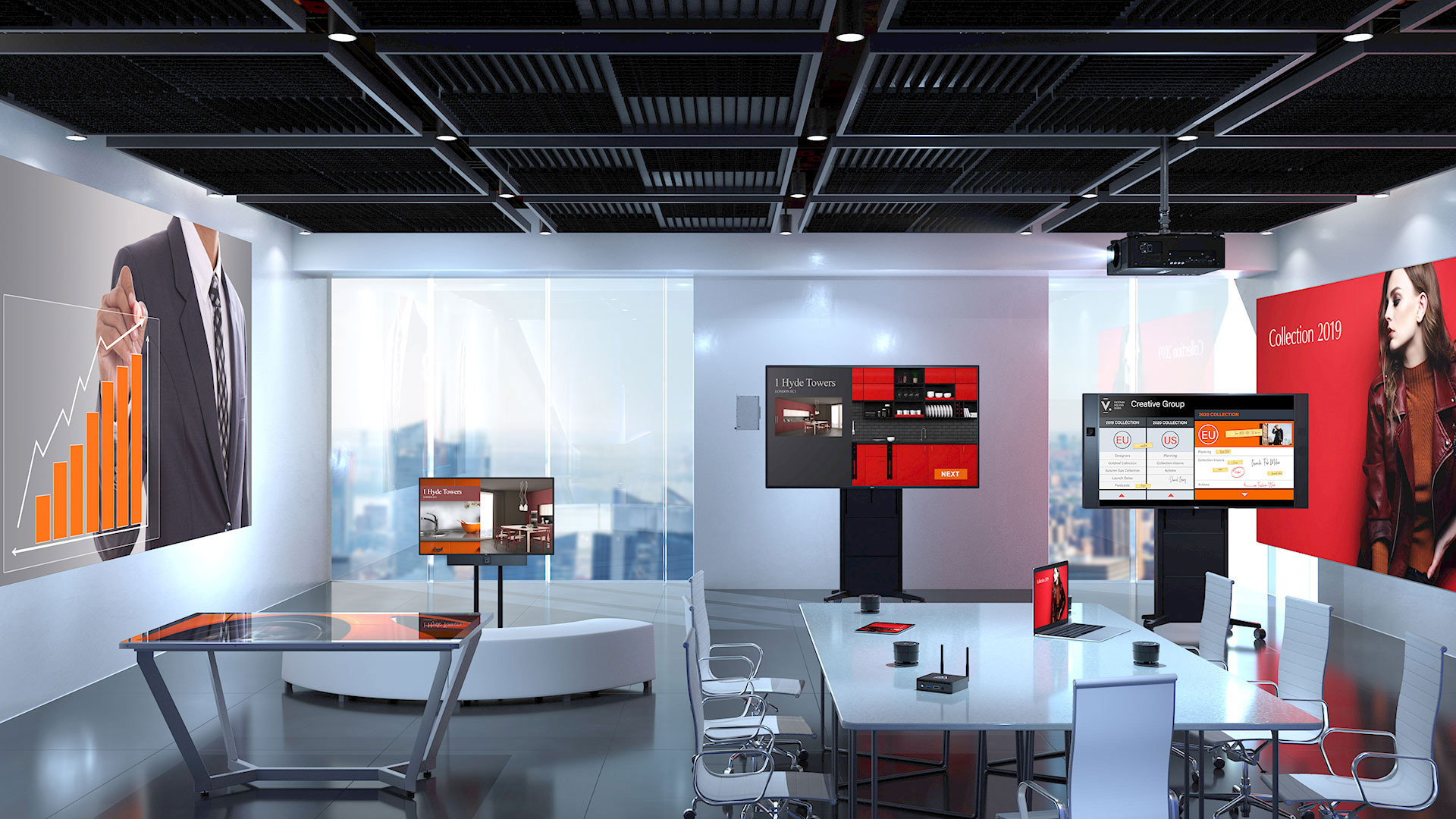 Videowalls LCD y LED, pantallas de gran formato e interactivas, Sistemas de videoconferencia y colaboración, Señalización digital (Digital Signage), Proyectores y sistemas de proyección avanzados, interfaces de video (divisores, escaladores, matrices, controladores, etc.), pantallas de proyección, herrajes y sistemas de montaje, cableado y accesorios. Sistemas de sonorización profesional para espacios de distintos tamaños (salas de juntas, auditorios, salones de eventos), Audio ambiental y sistemas de voceo, Microfonía especializada, Sistemas de audio para videoconferencias y telepresencia.